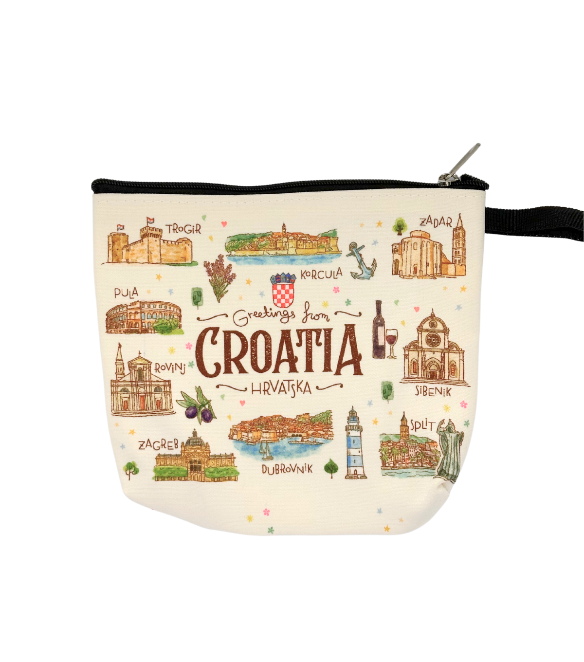 Praktična platnena torbica s ilustracijama hrvatskih gradova i prirodnih motiva. Idealna za putovanja, sitnice ili kao suvenir s domaćim šarmom.