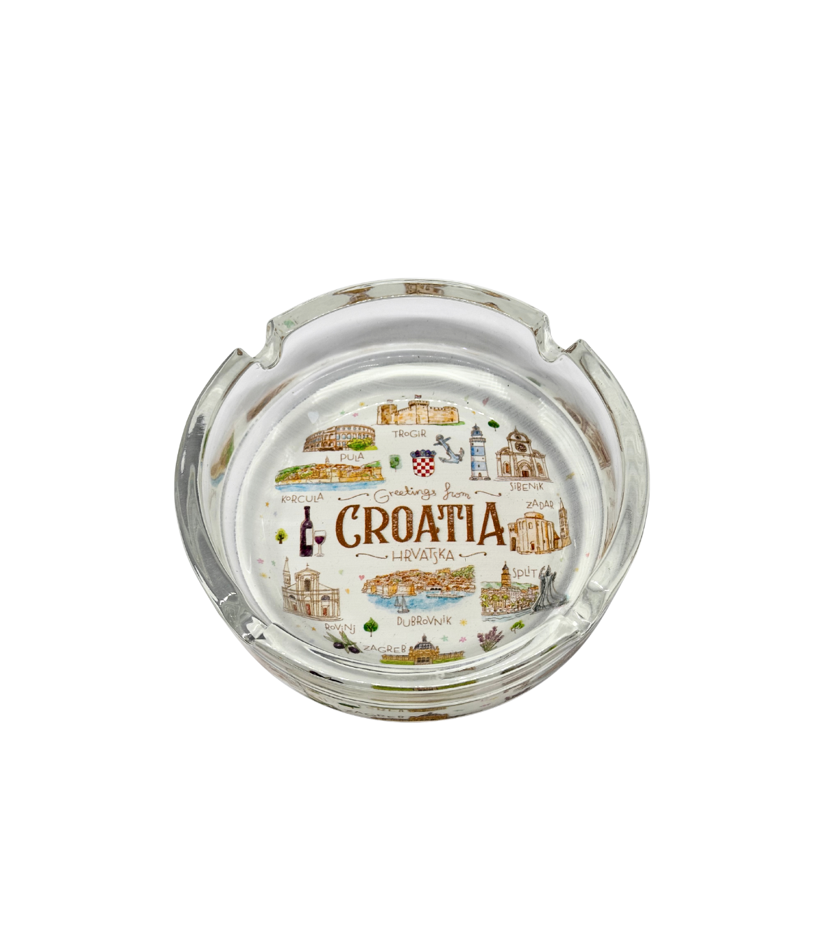 Staklena pepeljara s ilustracijama i natpisom u sredini. Kombinacija praktične upotrebe i suvenir dizajna.